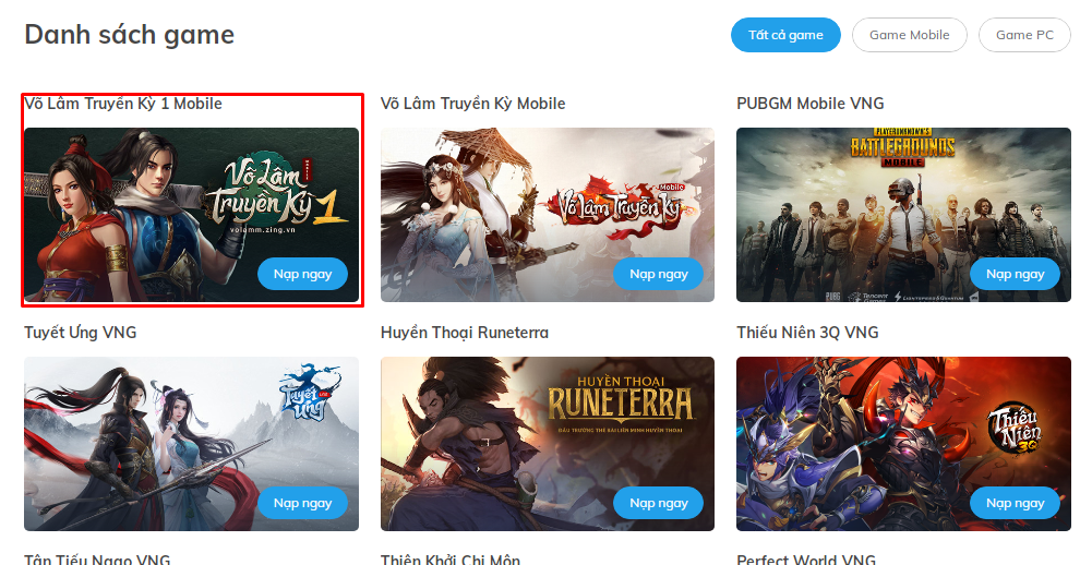 Bước 2: Truy cập địa chỉ https://pay.zing.vn/ chọn game Võ Lâm Truyền Kỳ