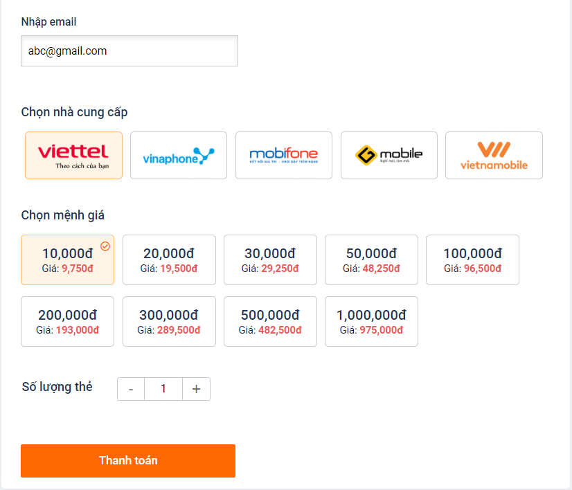 Bước 1: Chọn dịch bạn muốn sử dụng. Điền đầy đủ thông tin trên màn hình yêu cầu, sau đó ấn “Thanh Toán”.