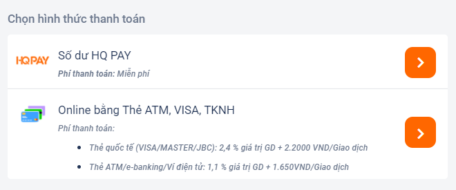 Hiện tại, HQ Pay đang chấp nhận 2 hình thức thanh toán, bao gồm: