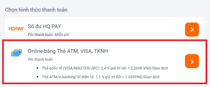 - Hình thức thanh toán này áp dụng cho người dùng có hoặc không có tài khoản HQ Pay.