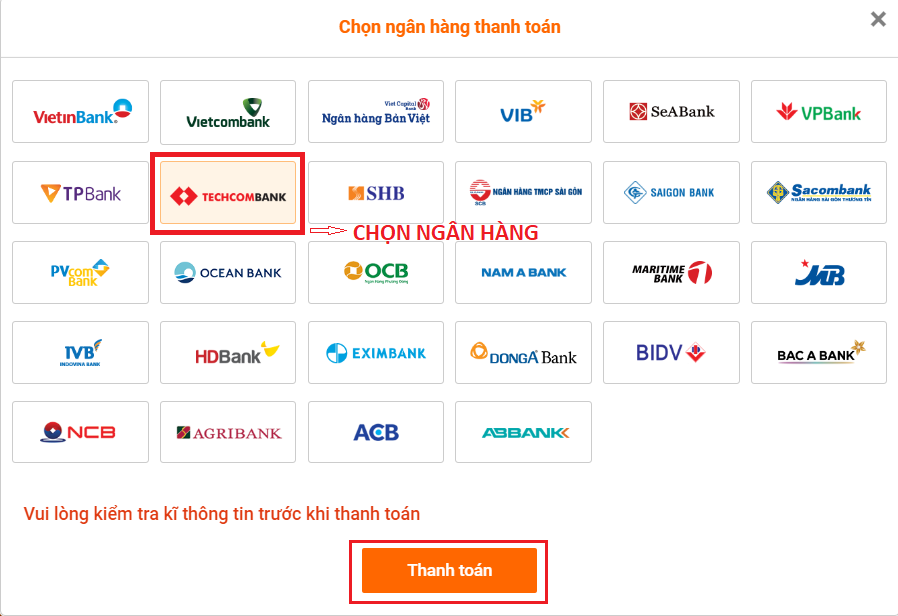 Bước 3: Chọn ngân hàng bạn muốn sử dụng. Sau đó ấn nút “Thanh toán”.