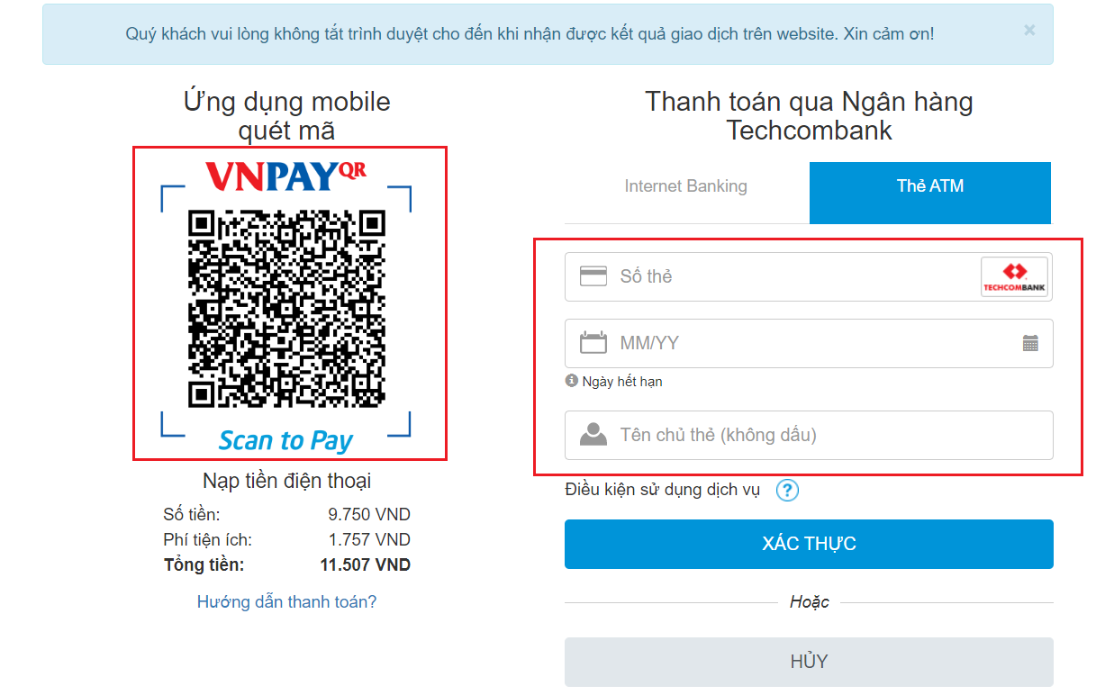 Bước 4: Quét mã QR được hiển thị trên màn hình hoặc điền thông tin số thẻ/ số tài khoản ngân hàng, cuối cùng ấn “Xác nhận”.